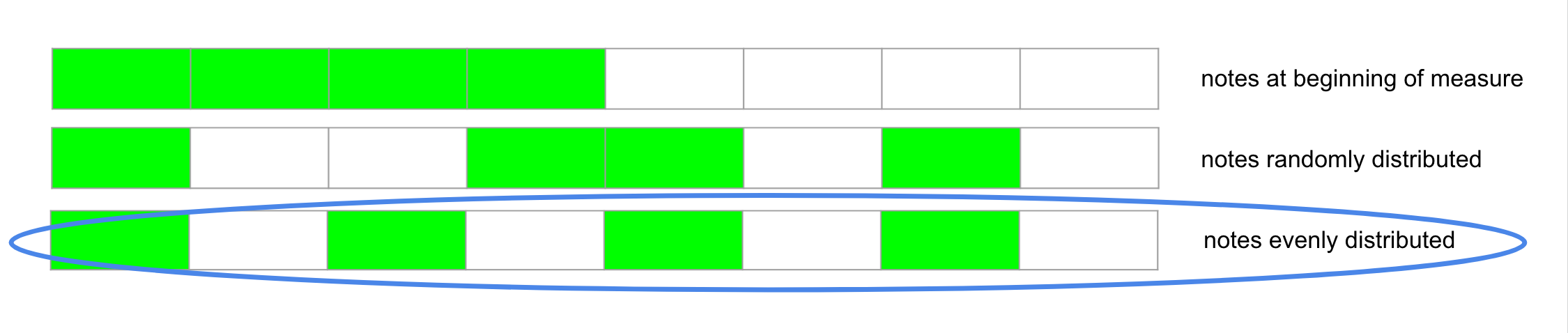 In a Euclidian Rhythm, notes are distributed as evenly as possible throughout a measure. Here, I show different ways of distributing four notes over an eight-beat measure.